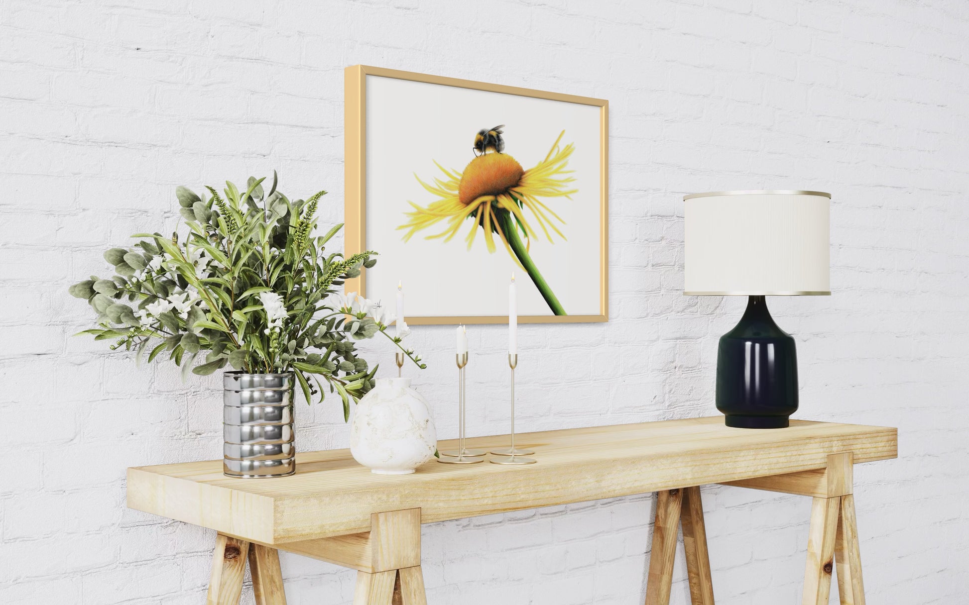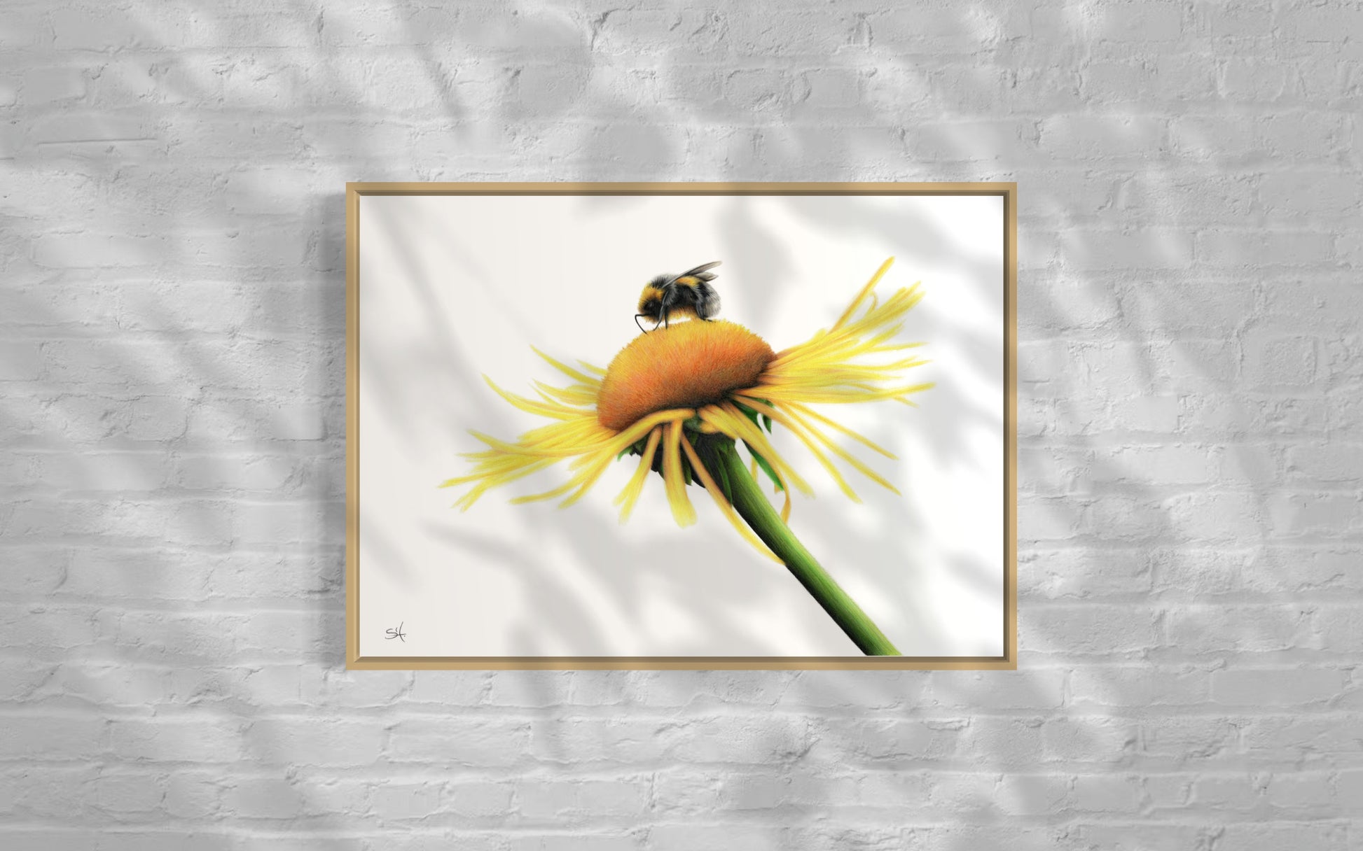 This bee-inspired print features a detailed depiction of a bee in the act of pollination. This showcases the importance of bees in our ecosystem and serves as a beautiful addition to any space.